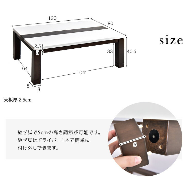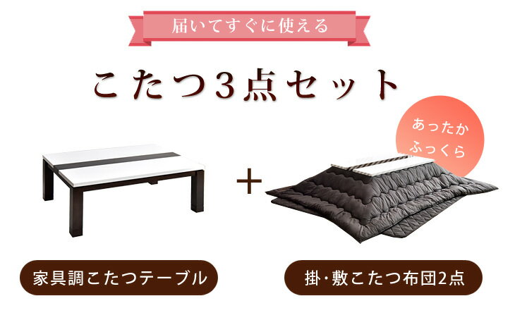 ▼ テーブル、こたつ布団単品の販売もございます ▼ こたつテーブル単品 掛・敷布団2点セット 仕様 こたつ本体 サイズ 幅120×奥行き80×高さ35.5(+5)cm こたつ布団 サイズ 【敷布団】245×190cm 【掛布団】260×205cm 素材 天板:MDF(ハイグロス転写) 塗装:UV塗装 フレーム:MDF 脚:ラバーウッド 素材 【敷布団】 表:ポリエステル100% 裏:ポリプロピレン100% 中綿:ポリエステル100%、ウレタンフォーム 【掛布団】 表裏:ポリエステル100% 詰め物:ポリエステル100% 中綿重量2.5kg 重量 約26kg カラー ダークブラウン ヒーター メトロ電気工業製ハロゲンヒーター 型番:MHU-601E 定格:AC100V 600W 50-60Hz 消費電力:600W 温度調節:手元電子コントロール式 発熱体:U字形 ハロゲンヒーター 【メーカー1年保証付き】 生産国 インドネシア 生産国 中国 備考 ※配送は全て宅配便(1人)での玄関渡しとなります。